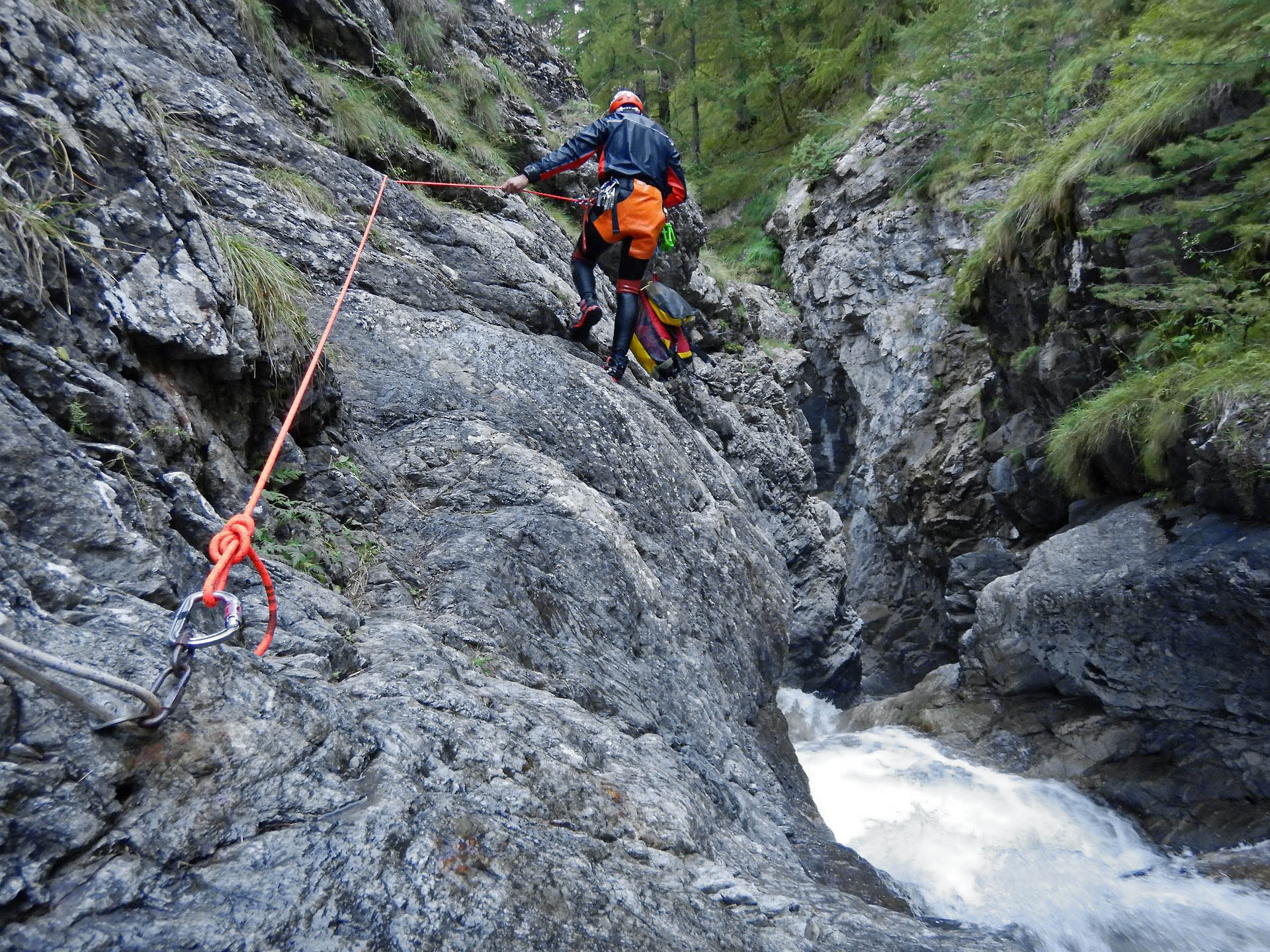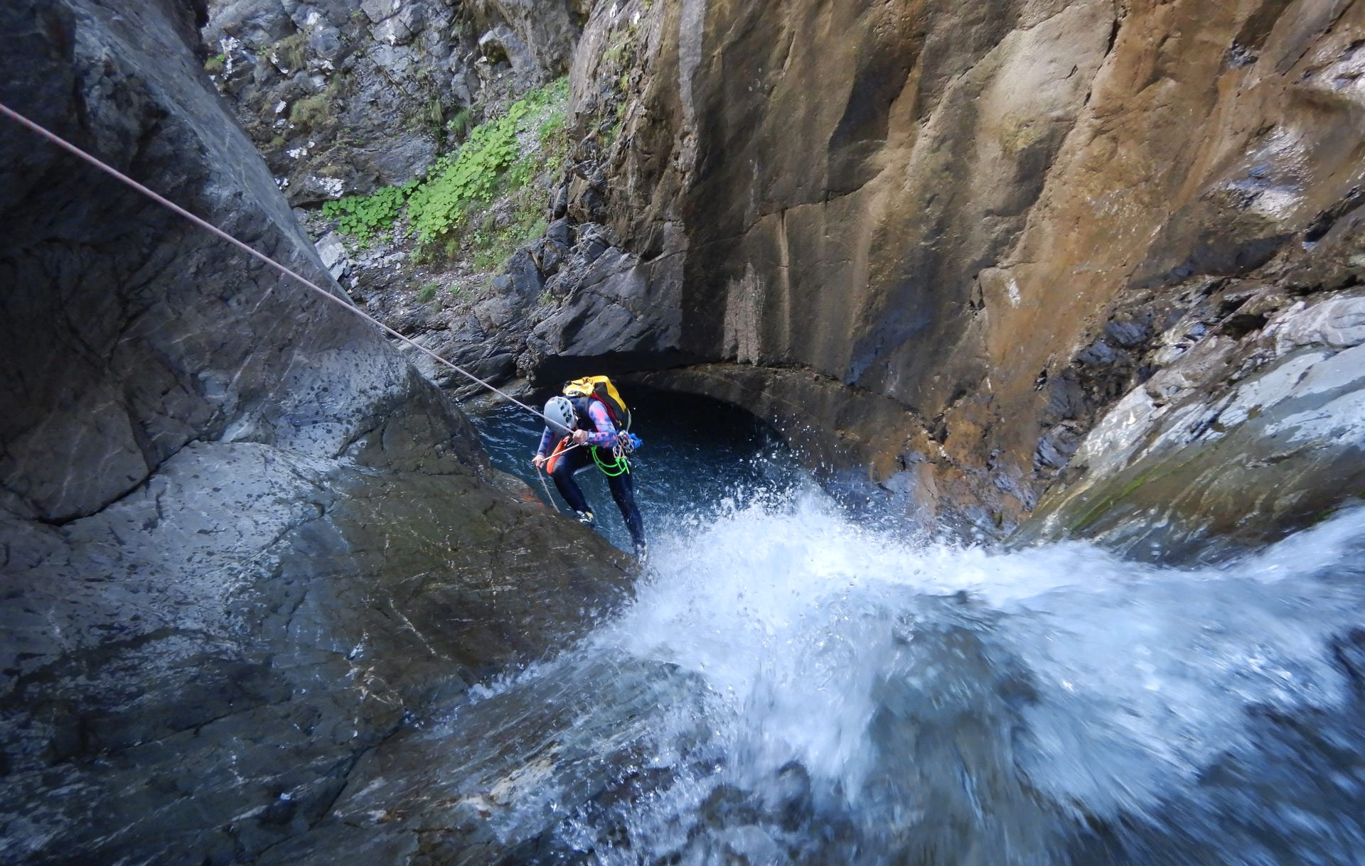 La descente alterne entre marche très brève, toboggans, sauts à tout-va, et descentes en rappel. Le premier toboggan donne le ton : ses 8 mètres de long débouchent dans une marmite bouillonnante qui nous bouscule et nous rafraîchit les idées. Chaque obstacle nous offre l’occasion de contempler les lieux et de nous pénétrer de leur caractère sauvage.